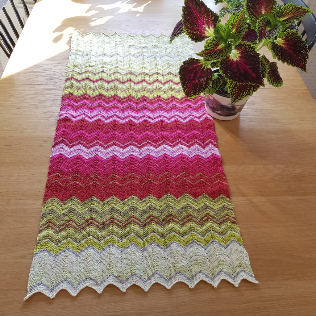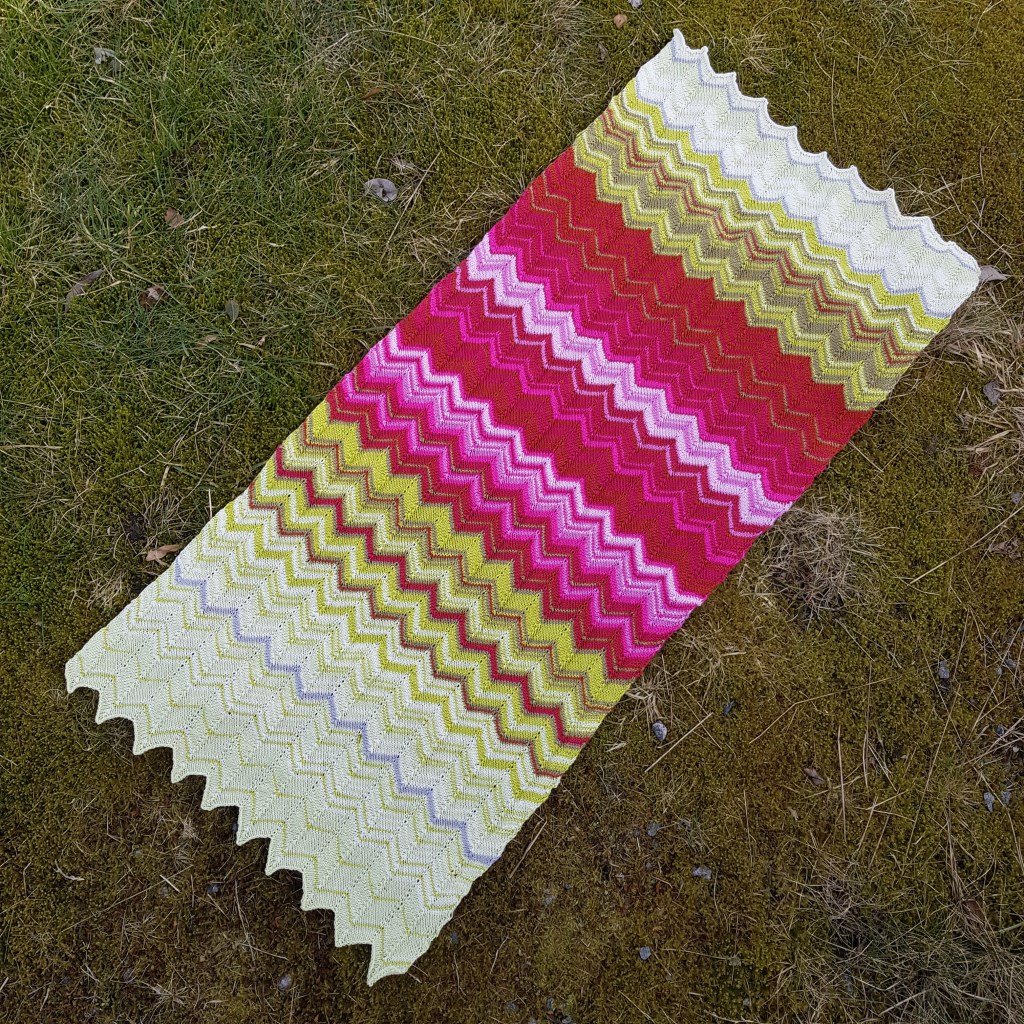 Dukens färdiga mått blev 88 x 40 cm. Det gick åt ett nystan av Sugarrush i varje färg. Detta kan ju ändras beroende på väder, så var beredd på att det kan bli kompletteringsköp av någon färg. Favoritgarner säljer färdiga garnpaket till temperaturfiltar/duk, kolla in dem här: https://favoritgarner.se/produkt/favoritgarners-temperaturfilt-temperaturduk-2020/