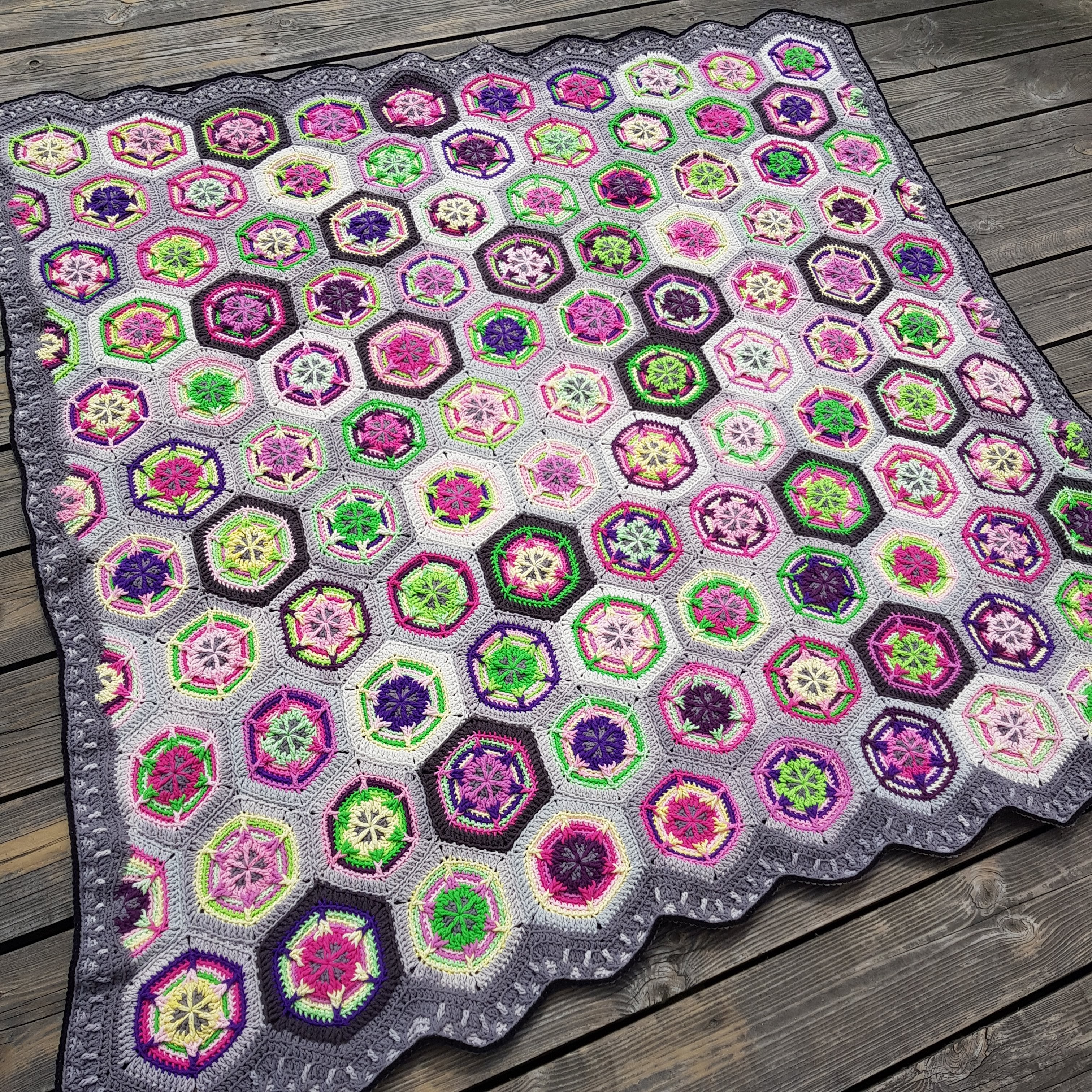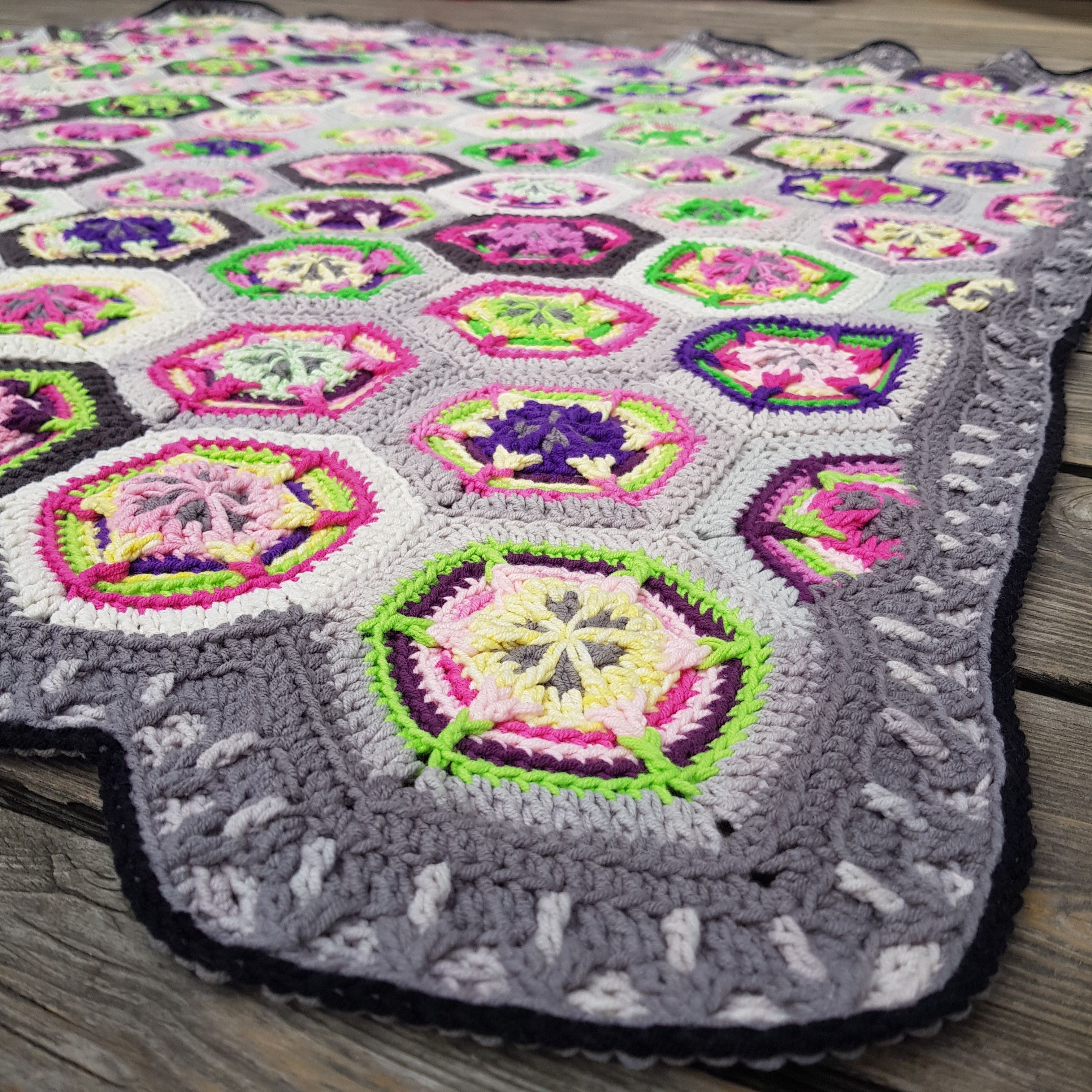 Virka så många hexies du behöver för att få en filt i lagom storlek, min filt är 120 x 120 cm. Jag gjorde halva hexies för att få raka kanter, men jag har inget mönster på dem, helt enkelt för att de blev rätt kassa (inte heeelt raka liksom så jag fick ordna till dem när jag virkade kanten) så antingen improviserar du egna, t.ex. kan du göra helt vanliga halva hexies (finns massa mönster på nätet på det) eller så låter du kanten vara oregelbunden. Kanten improviserade jag också bara, så inte heller det finns det mönster på. 🙂 (Men du kan tänka 3 maskor i hörnen, 3 maskor tillsammans i ”dalarna” och sen en maska i varje maska.)