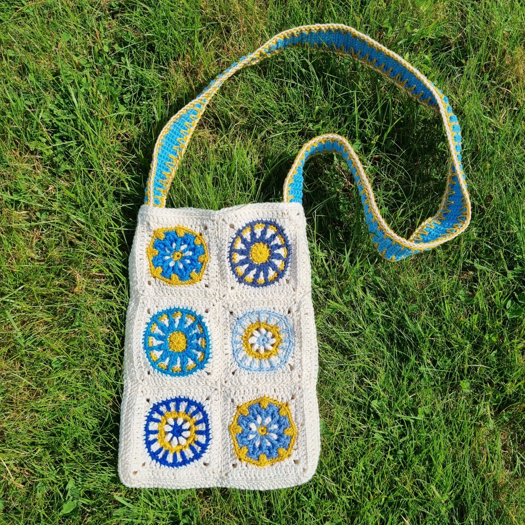 I assembled my squares into a small bag. Perfect size for a walk, where a bottle easily fits (and stays upright) together with my cellphone.